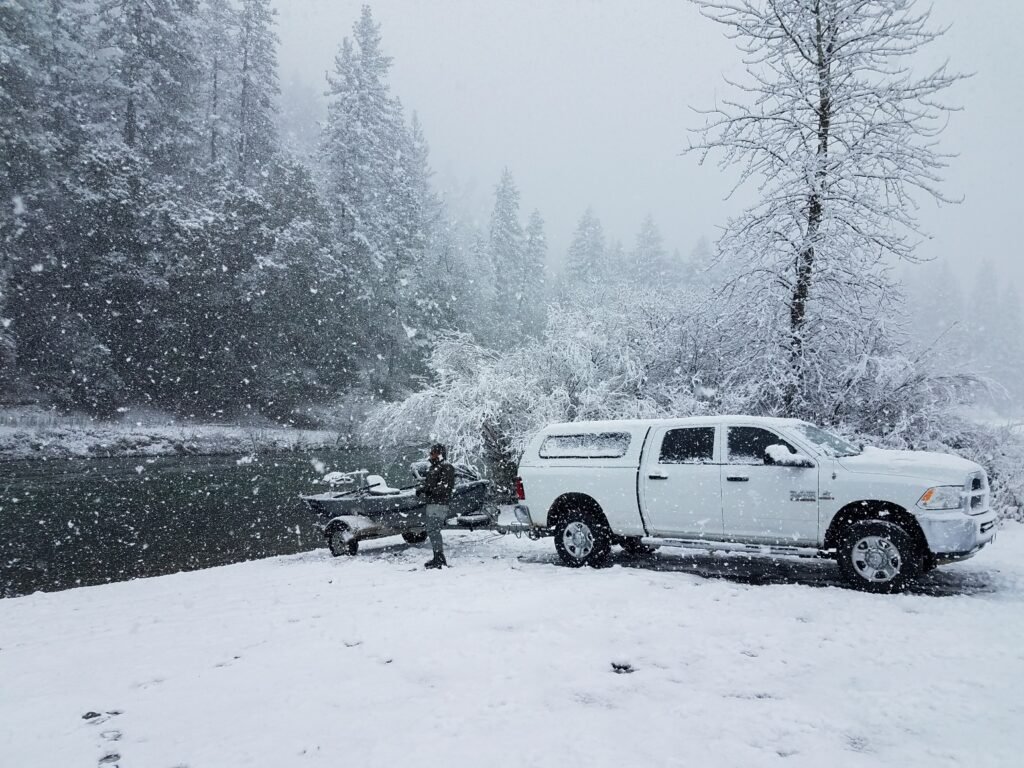 Winter steelheading on the Trinity is for anglers who love true steelhead weather—snow, rain, wind, freezing temperatures, cold water, and huge fish. This is the most sensitive part of the season because everything depends on Mother Nature. But when conditions line up and the river is not blown out, it can be absolutely outrageous. This is when some of the largest wild steelhead of the year enter the system, with fish pushing fifteen pounds. Water temperatures drop into the low forties, but unlike the fall fish and cold water temps, these winter fish become incredibly grabby on swung flies. On the right day, with the right water, you can even skate a winter steelhead on the surface. Yes—it happens. And when it does, it is absolutely unreal. Then comes what might be the coolest secret of the entire season. As we move into late winter to early spring—February, March, and even April—on slightly warmer days with overcast skies, the Trinity can erupt with midday dry-fly hatches. March Browns, stoneflies, and Callibaetis bring steelhead and massive brown trout to the surface in true sipping fashion. Watching a full-grown steelhead rise to a dry fly in the middle of winter will change the way you think about fly fishing forever. If winter conditions become unfishable due to weather or flows, we can move to another fishery like Lewiston Lake or the Lower Sac, or we can reschedule to a later date. We want to keep your trip productive and safe. Advanced booking is a very good idea for this portion of the season.